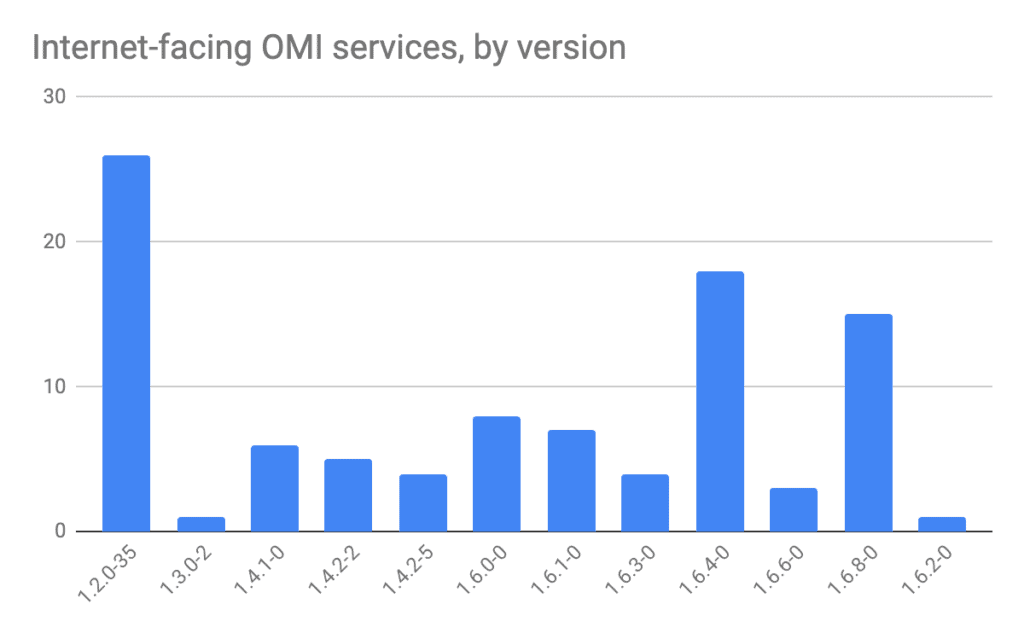 56101 known exposed services worldwide that are likely vulnerable to this issue, including a major health organization and two major entertainment companies. The small footprint can be associated with nuances of how the OMI service responds, and that exposing OMI to the Internet likely requires deliberate effort. - Network scanners miss the OMI service unless they report on open sockets even when the socket does not return information, or they coerce the service to respond using a Content-Type header.
