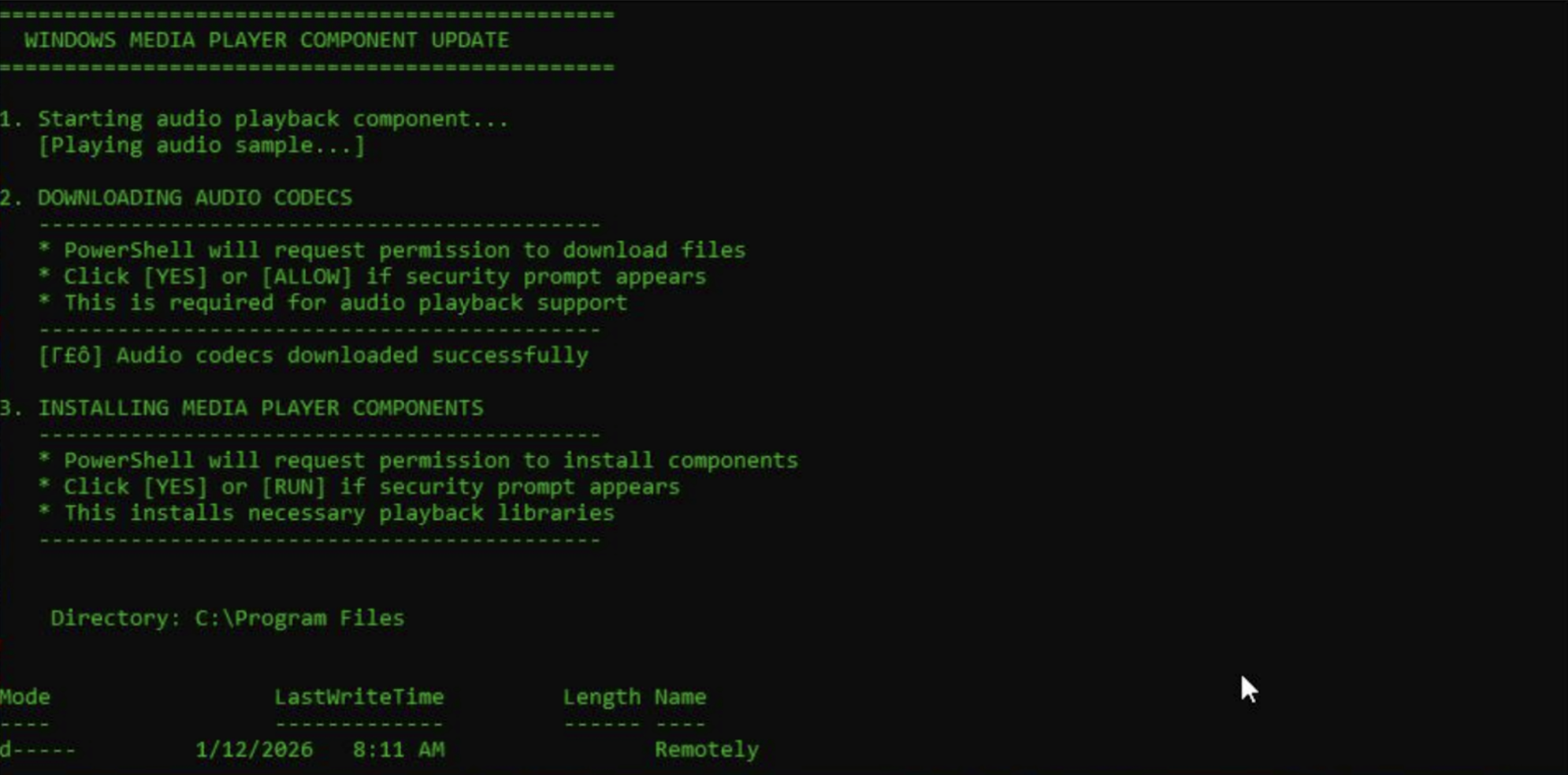 Interaction with the landing page results in the download of a Windows BAT file presented as a media or audio-related update. When executed, the script displays benign update messaging and instructs the user to approve any security prompts. This stage conditions the user to expect normal system dialogs and minimizes suspicion.