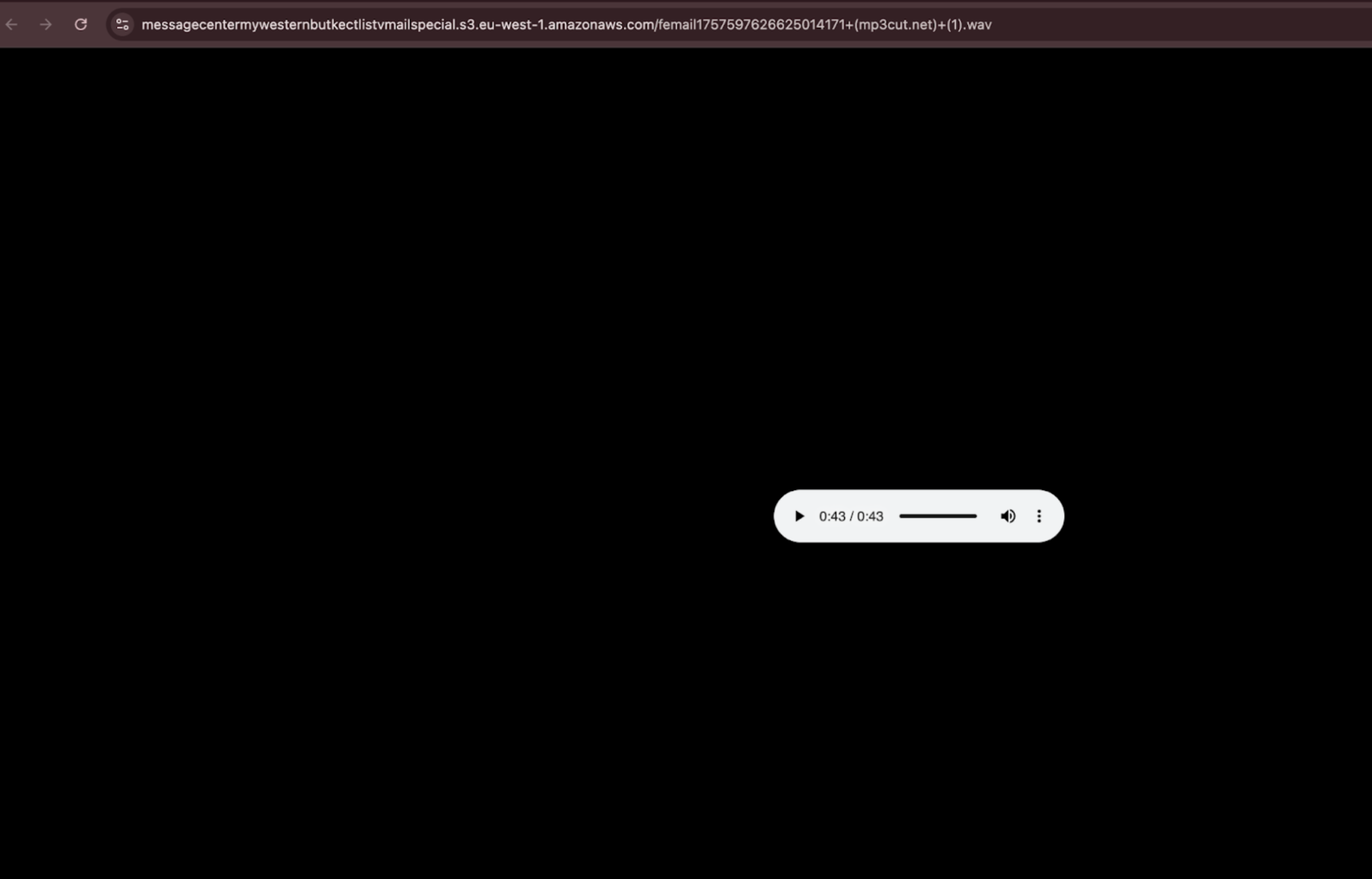 | URL | hxxps://messagecentermywesternbutkectlistvmailspecial[.]s3[.]eu-west-1[.]amazonaws[.]com/femail1757597626625014171+(mp3cut[.]net)+(1)[.]wav |