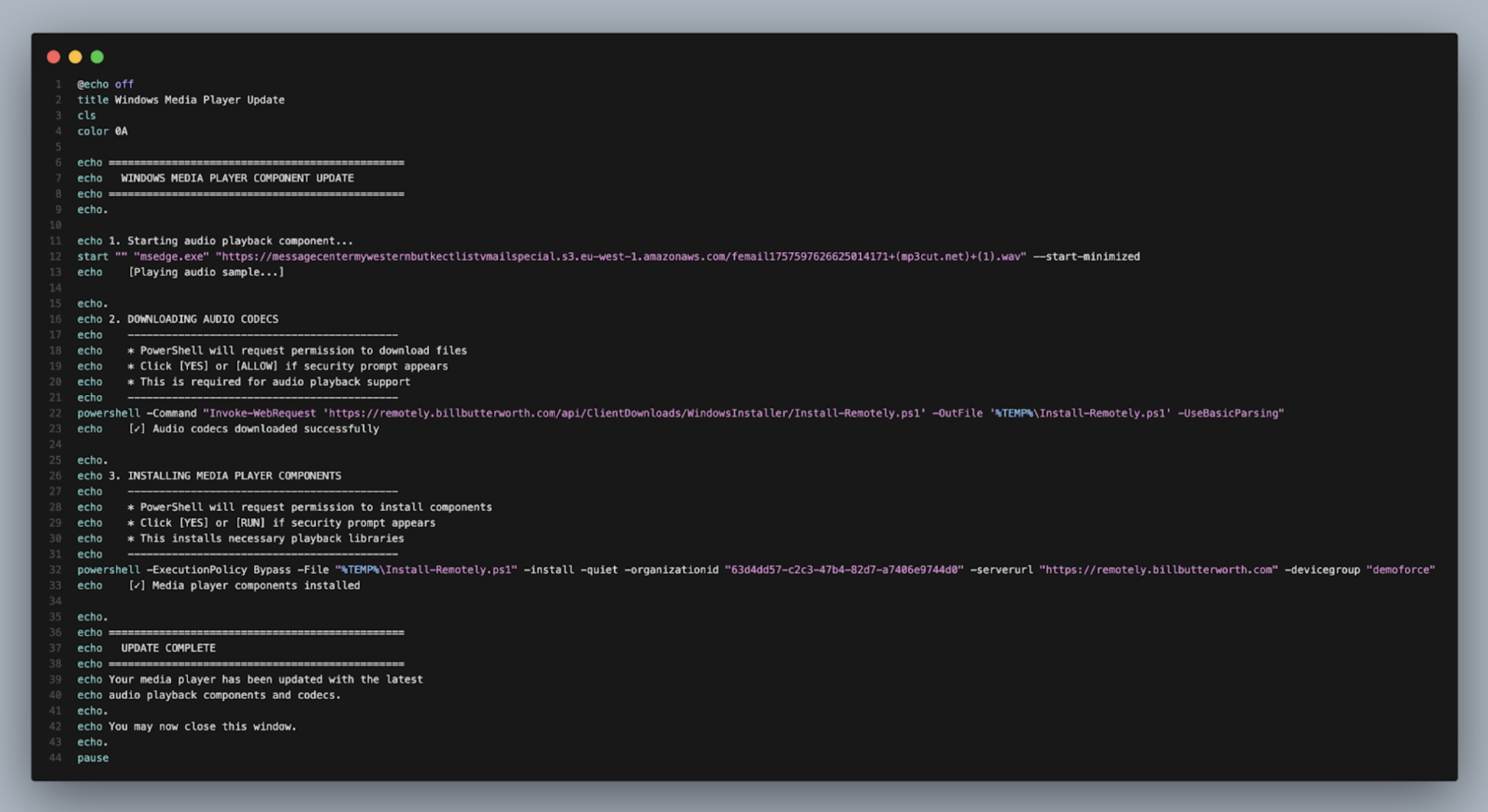 While the audio plays, the script installs Remotely RMM, a legitimate remote monitoring and management tool. The audio is in English and contextually irrelevant. The installation enrolls the victim system into an attacker-controlled environment, enabling persistent remote access and management.