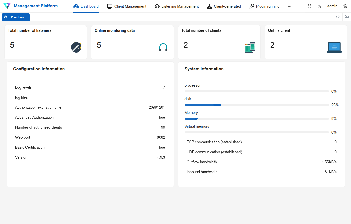 Vshell uses “listeners,” which are the service components within the controller that accept inbound connections and manage communications with deployed clients; these are configured in through 监听管理 (“Listener Management”). Service configuration varies across deployments; however, several of the listener services within Vshell default to port TCP/8084. The operator creates a listener by selecting the transport/protocol and specifying connection parameters (for example, bind address/interface, port, and any authentication or encryption options presented by the UI). Once enabled, the listener remains available to receive new client sessions and to broker tasking, data transfer, and tunneling features through the established channel.