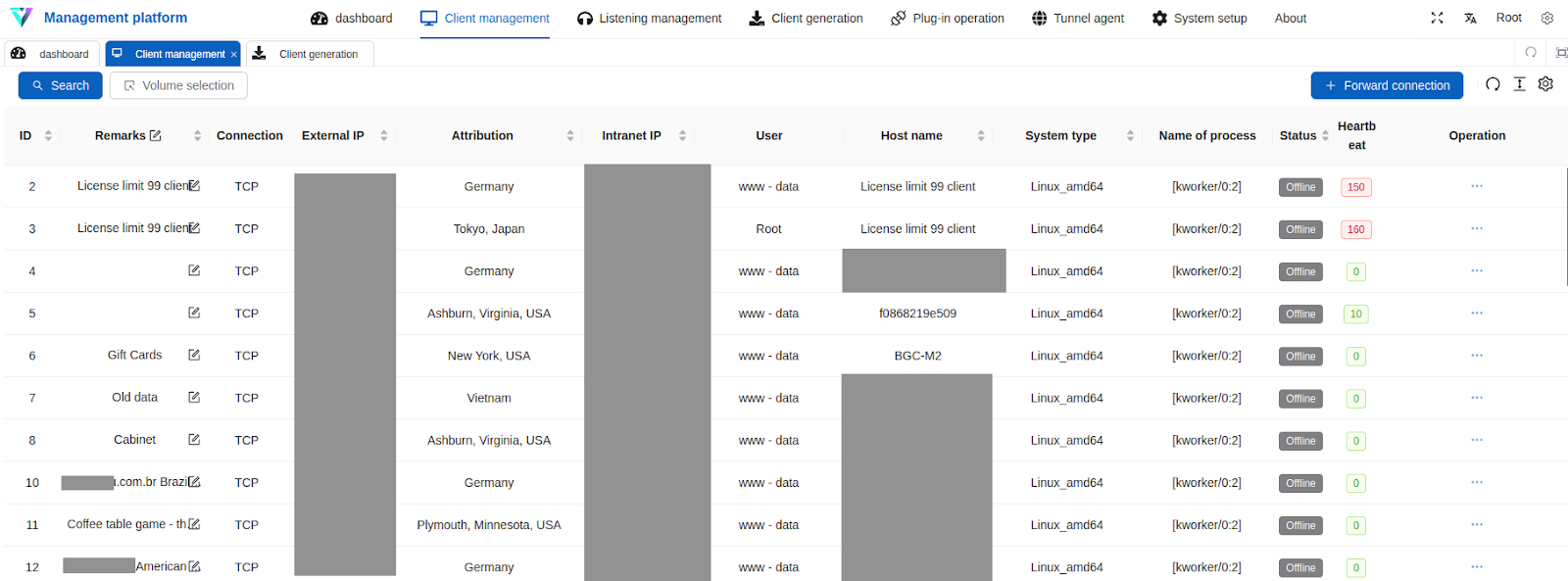Its distribution model has varied by version, with some releases available as open source and others provided in closed or partially closed form. Internet-facing instances identified via Censys have appeared alongside other common intrusion and red-team tooling such as the commercial adversary simulation tool Cobalt Strike; additionally, exposed web directories have revealed Vshell deployments configured with hundreds of client agents, each of which could be leveraged as a traffic relay for lateral movement and operational proxying. A screenshot of a Vshell panel recovered from an open web directory with 286 attached clients is shown below: