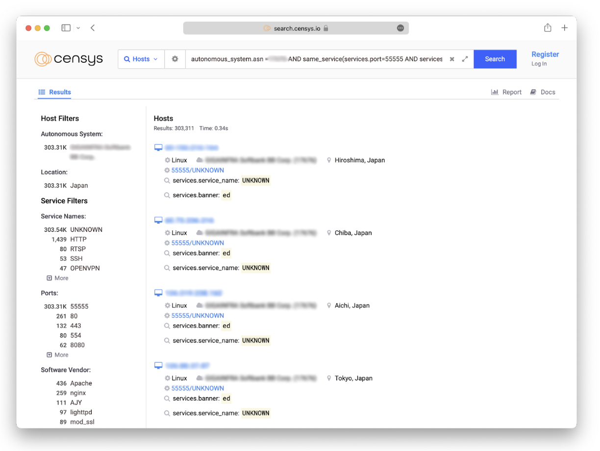In my case, I wanted to filter for hosts with one specific combination of autonomous system, port, service, and banner message. My Censys Search query looked something like this: