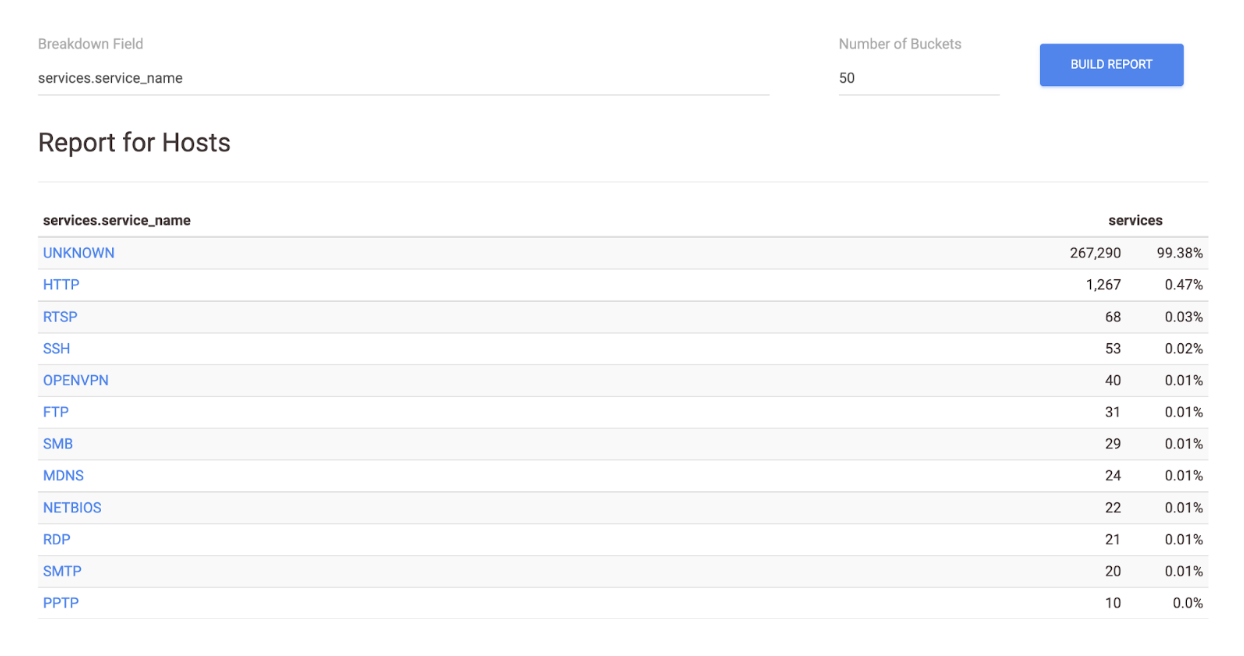Each service running on a host is captured by the services.service_name attribute. Generate a report with this attribute set as the Breakdown Field to get further insight, noting that there can be multiple services running on one host. Keep your eyes peeled for any services that are particularly known to be frequently exploited by threat actors, such as SMB, RDP, and FTP.