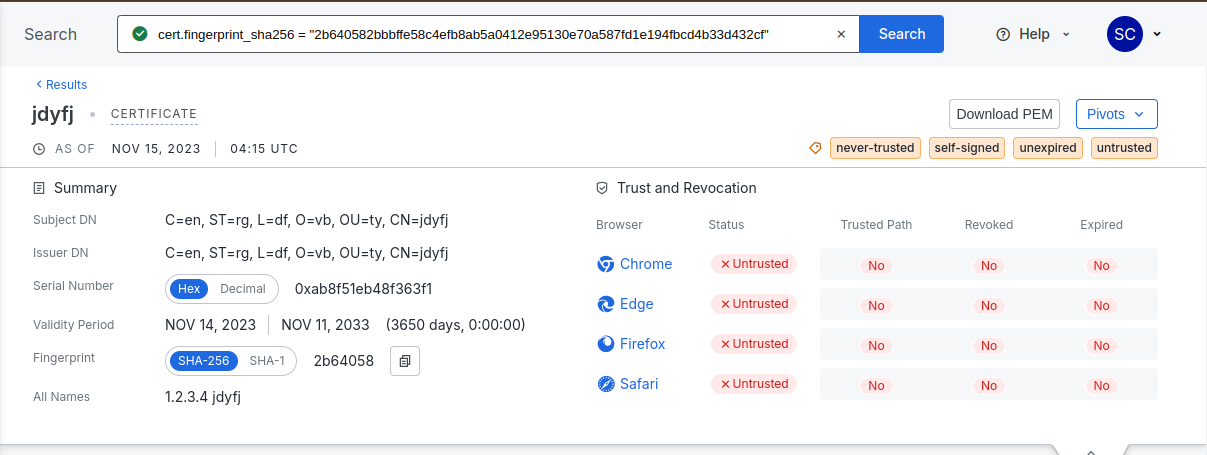 The Censys research team has identified three hosts currently leveraging this certificate (SHA256 Hash: 2b640582bbbffe58c4efb8ab5a0412e95130e70a587fd1e194fbcd4b33d432cf):