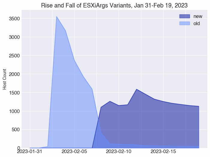 Last week, we discovered two potential early victims of ESXiArgs (Host-A, Host-B) after noticing that they were the only two hosts with the ransom note on February 1 and January 31, 2023. Manually searching our data, we determined that they’d had a variant of the ransom note since mid-October 2022, but we were curious whether more hosts were impacted prior to the ramp-up of the February 2023 campaign.