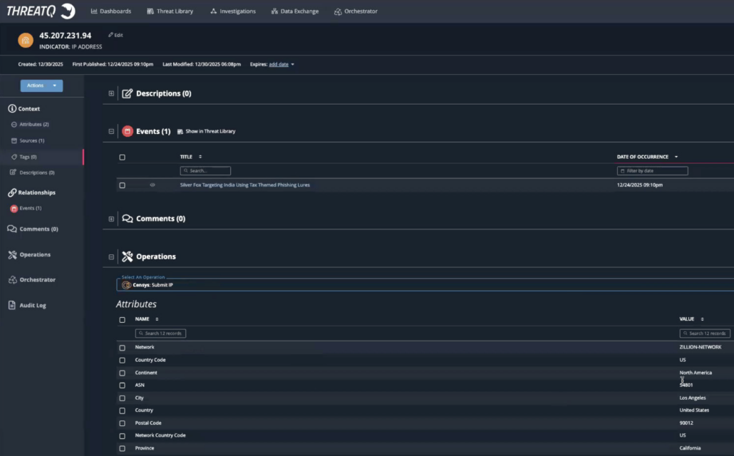 - Flexible data controls: Customers choose which Censys attributes to ingest into ThreatQuotient, tailoring enrichment to their operational needs.
